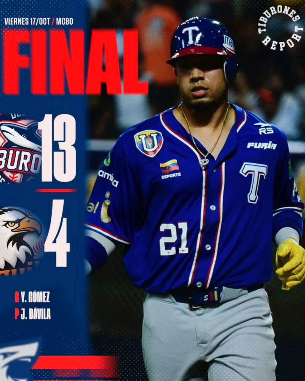Tiburones venció 13–4 a las Águilas del Zulia en Maracaibo. El duelo estuvo igualado en las dos primeras entradas: Zulia tomó ventaja en la 1.ª baja y La Guaira igualó en la 2.ª alta; luego los litoralenses pasaron al frente y los marabinos empataron nuevamente en la 2.ª baja.