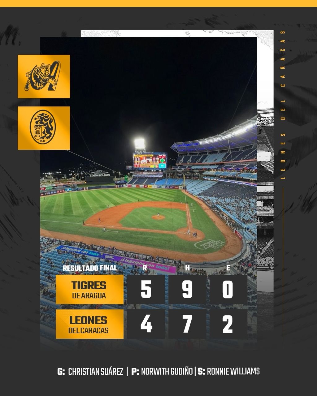 Pero, el juego no acaba hasta el out 27. En el 9no episodio, Aragua colocaría hombre en todas las almohadillas para empatar e irse arriba y dejar en el terreno a Los Leones. Concretando así su primera victoria de la semana y manteniendo así, el 2do puesto de la tabla de posiciones en la temporada 2025-2026 de la LVBP (@lvbp_oficial).