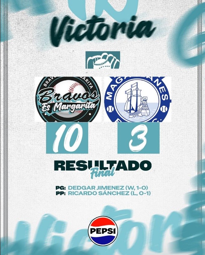 Andrelton Simmons (@andrelton2) intentó descontar, pero Valera volvió a aparecer con un sencillo en el sexto acto. Para el séptimo, un doble de Ramón Flores (@ramonflores16) y un batazo de out forzado de Edward Olivares (@e29_olivares) trajeron tres carreras más. Carlos Rodríguez (@carlosrodriguez0712) puso la tercera de Magallanes, pero Juan Santana (@elsantanita016) atacaría y sumaría dos más para Bravos en el octavo y Carlos Pérez (@cp1910) sentenciaría en el noveno.