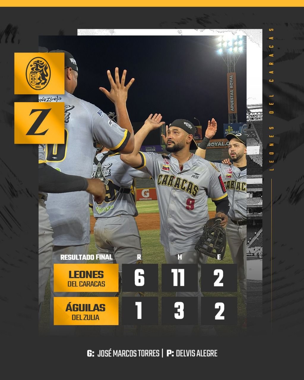 Con un rally de cuatro carreras en la octava entrada, los Leones del Caracas se despegaron en el marcador y terminaron imponiéndose 6-1 sobre las Águilas del Zulia este 12-12-2025 en el Estadio Luis Aparicio.