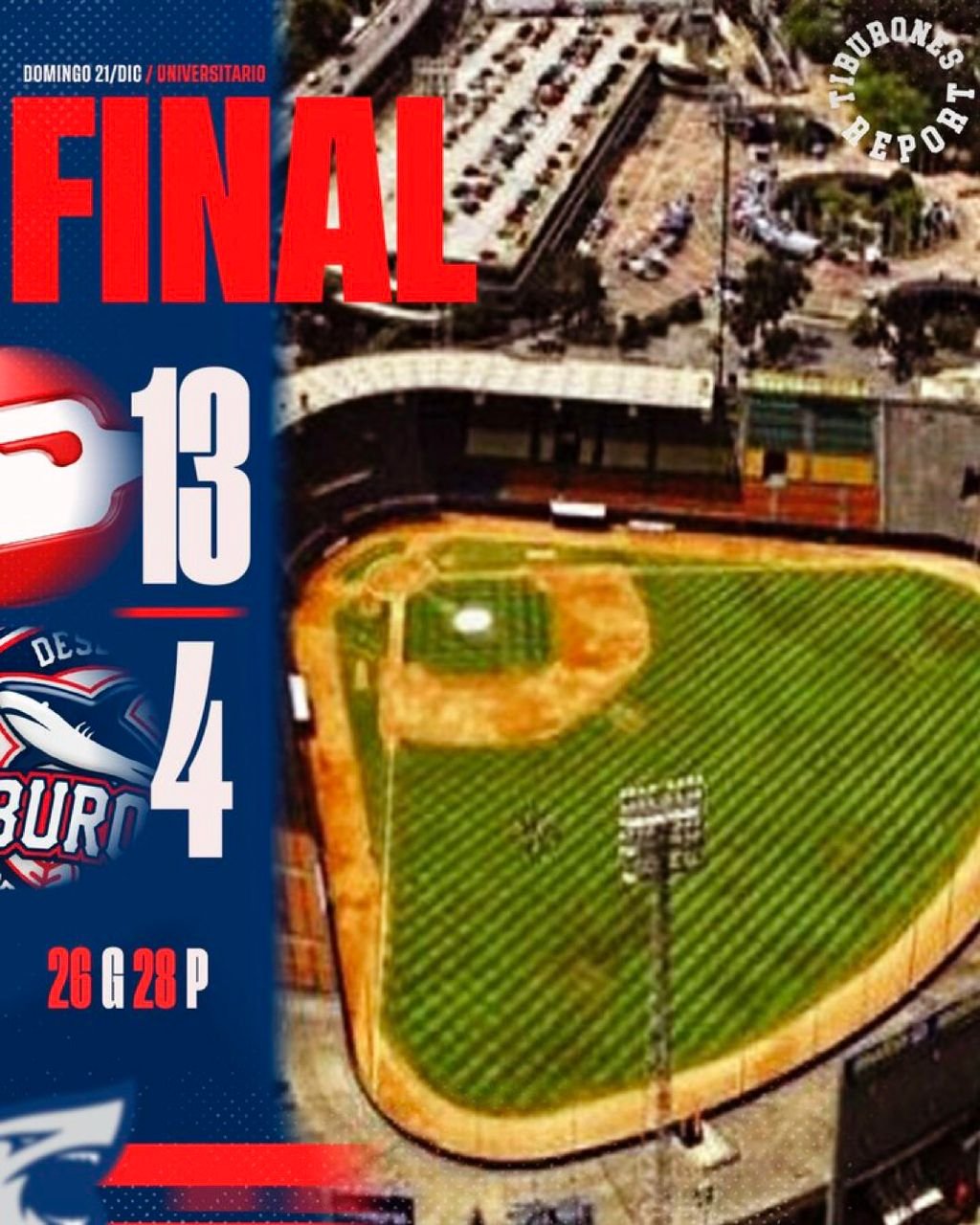 Los Cardenales de Lara desataron una ofensiva de 18 imparables y vencieron este domingo 21 de diciembre de 2025 a los Tiburones de La Guaira, 13 carreras por 4, en el Estadio Universitario.