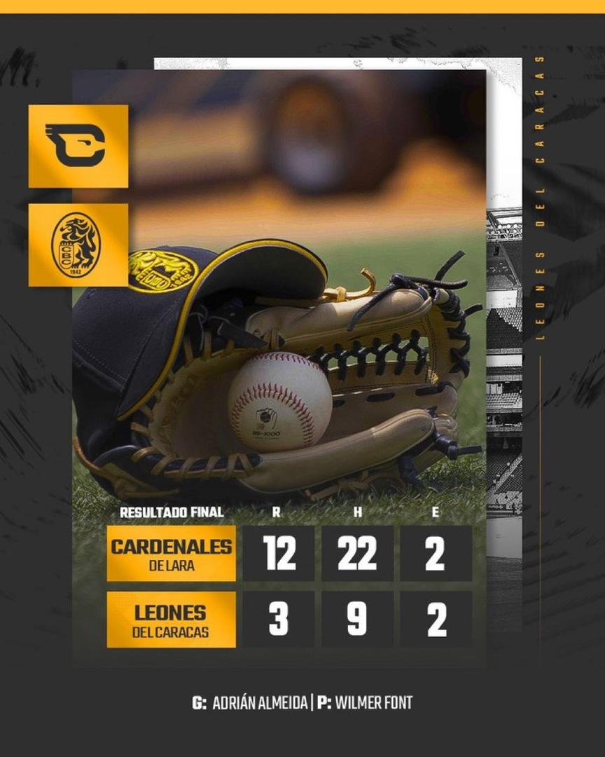 Los Cardenales de Lara castigaron desde temprano el pitcheo del Caracas y terminaron imponiéndose 12-3 la noche del sábado 20 de diciembre de 2025 en el Estadio Monumental Simón Bolívar, con una producción de 22 hits y un ataque sostenido a lo largo de nueve innings. La victoria dejó a Lara con récord de 28-25, mientras que los melenudos quedaron en 22-30.