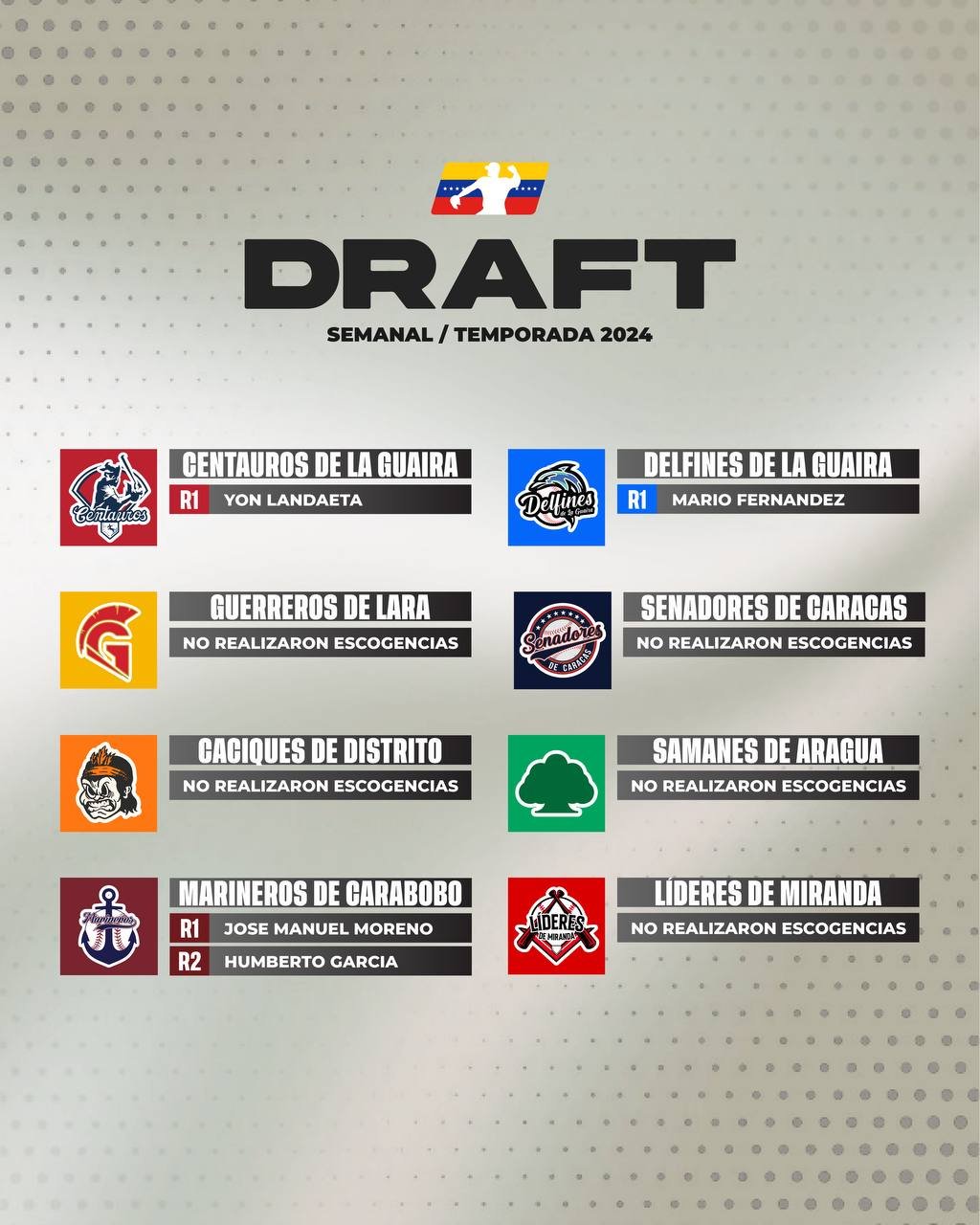 Por su parte, Delfines de La Guaira se hizo con Mario Fernández, mientras que Marineros de Carabobo eligieron a José Manuel Moreno y Humberto García en el draft semanal.