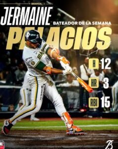 El Jugador Venezolano Jermain Palacios del Equipo Bravos de León Liga Mexicana de Béisbol representado por Mado sports business Group fue el jugador mas destacado de su equipo en esta semana que Finaliza. Ligo un total de 13 imparables, 3 home rum y 16 carreras empujadas para un average de 333 en un total de 36 apariciones legales.