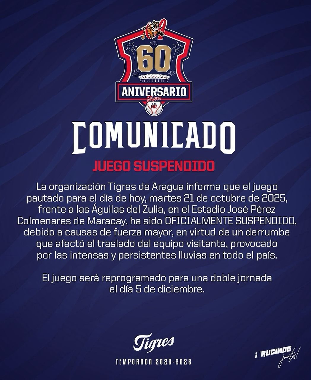 Por motivos de fuerza mayor el sexto encuentro de Tigres de Aragua vs Águilas del Zulia que se iba efectuar en el estadio José Pérez Colmenares de Maracay queda pospuesto la liga y los equipos se pondrán de acuerdo para programar dicho encuentro.