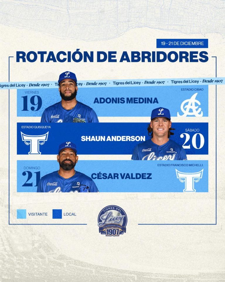 Con la mira puesta en mejorar su ubicación, el dirigente Gilbert Gómez dio a conocer la rotación de lanzadores abridores para el fin de semana, una estrategia clave en el empuje final del equipo. Adonis Medina está programado para abrir el viernes 19, Shaun Anderson tomará la pelota el sábado 20 y César Valdez será el encargado del domingo 21, en una apuesta clara del cuerpo técnico por la experiencia y el control desde el montículo para seguir en la pelea por un boleto a la siguiente fase.