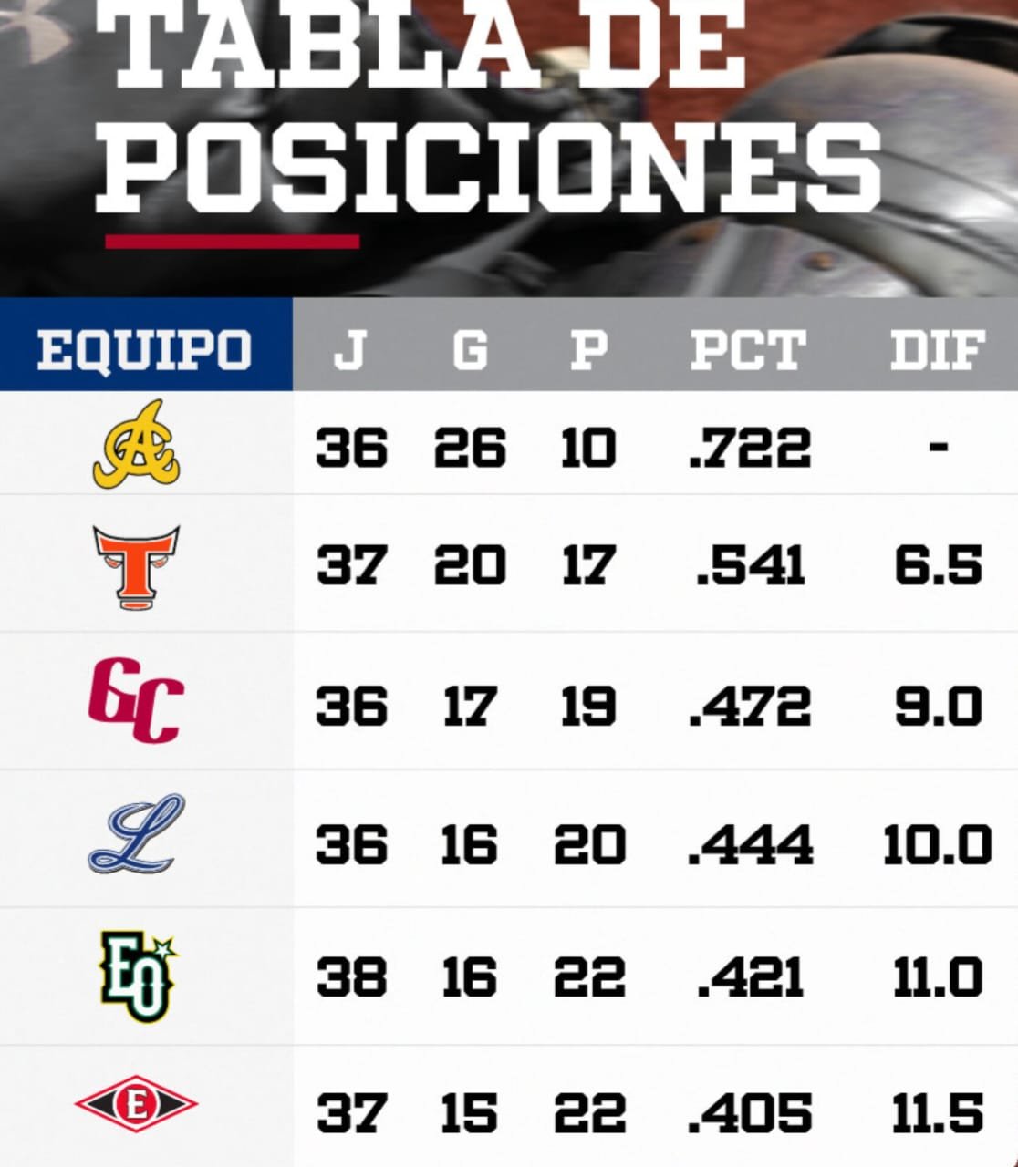 Santo Domingo. La Liga Dominicana de Béisbol (LIDOM) cumple este lunes con su jornada de receso, pero la tabla de posiciones continúa siendo objeto de análisis debido a la cerrada competencia entre los equipos. Las Águilas Cibaeñas se mantienen firmes en el primer lugar con récord de 26-10 (.722), distanciándose de unos Toros del Este que ocupan la segunda posición con 20-17 (.541), a 6.5 juegos. Más atrás, los Gigantes del Cibao presentan marca de 17-19 (.472), seguidos de cerca por los Tigres del Licey con 16-20 (.444), a 10.0 juegos del liderato.