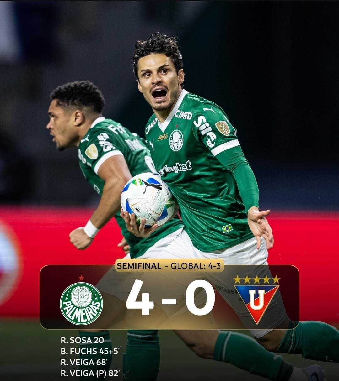 El SE Palmeiras logró una remontada histórica y espectacular al golear 4-0 a Liga Deportiva Universitaria de Quito (LDU Quito) en el Allianz Parque, revirtiendo la derrota 3-0 de la ida para imponerse 4-3 en el marcador global y clasificar a la final de la CONMEBOL Libertadores.
