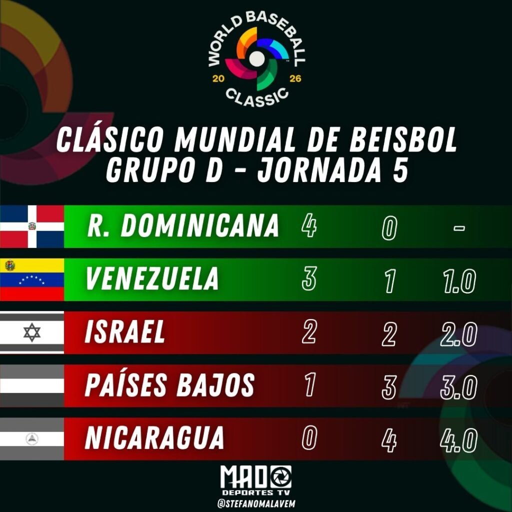 La República Dominicana dominó con su poderosa ofensiva a Venezuela y finalizó con cuatro triunfos en la cima del Grupo D, evitando así a Japón, que terminó primera en el Grupo C.