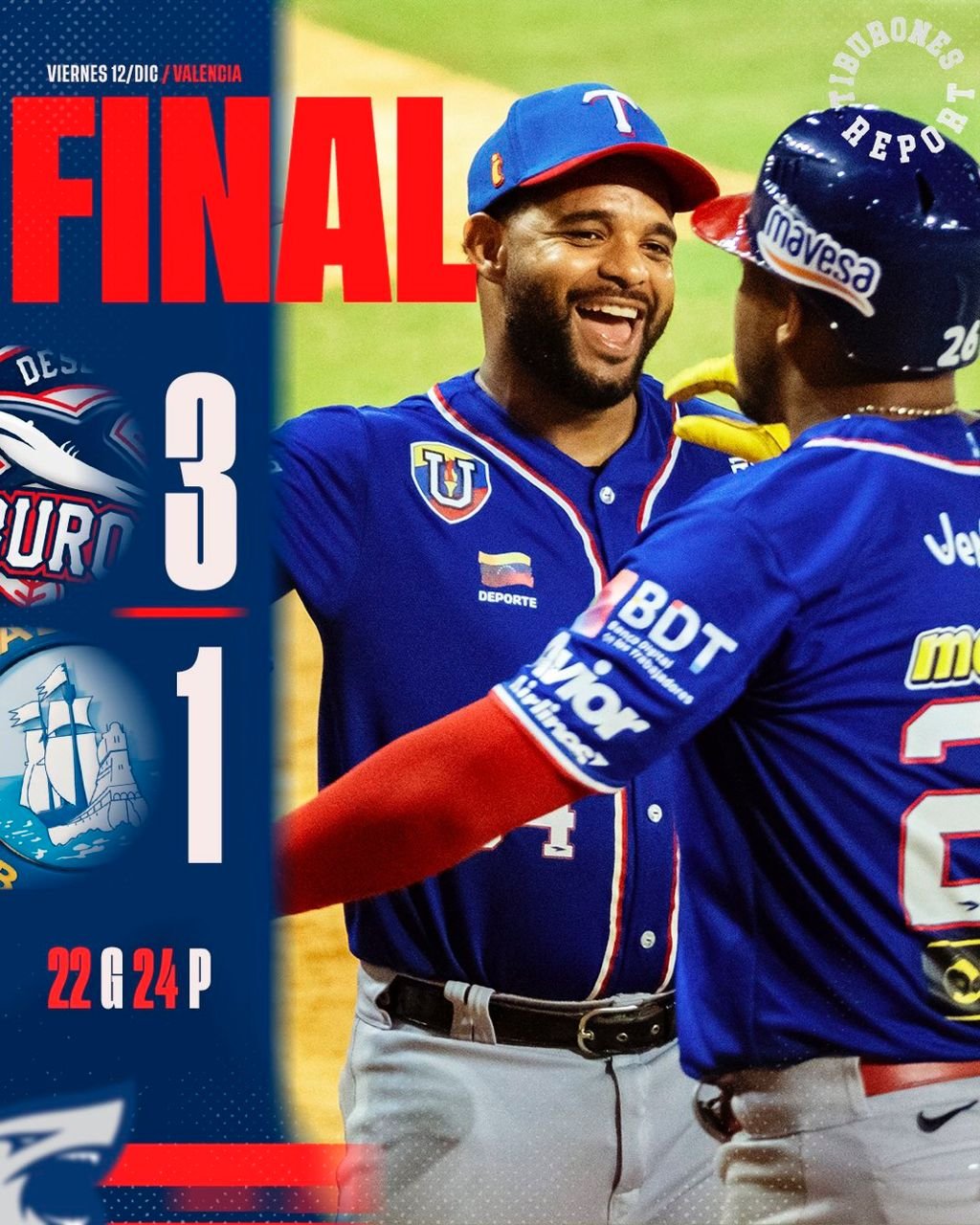 Tiburones Se Impuso 3 carreras a 1 Sobre Magallanes, Tiburones Sube a la sexta posición con 22 ganados y 24 perdidos en la Sexta posición, y Magallanes a la séptima con 21 ganados y 24 perdidos Tiburones se puso Arriba en la serie particular 4-2 y se aseguro no perder la serie Particular
