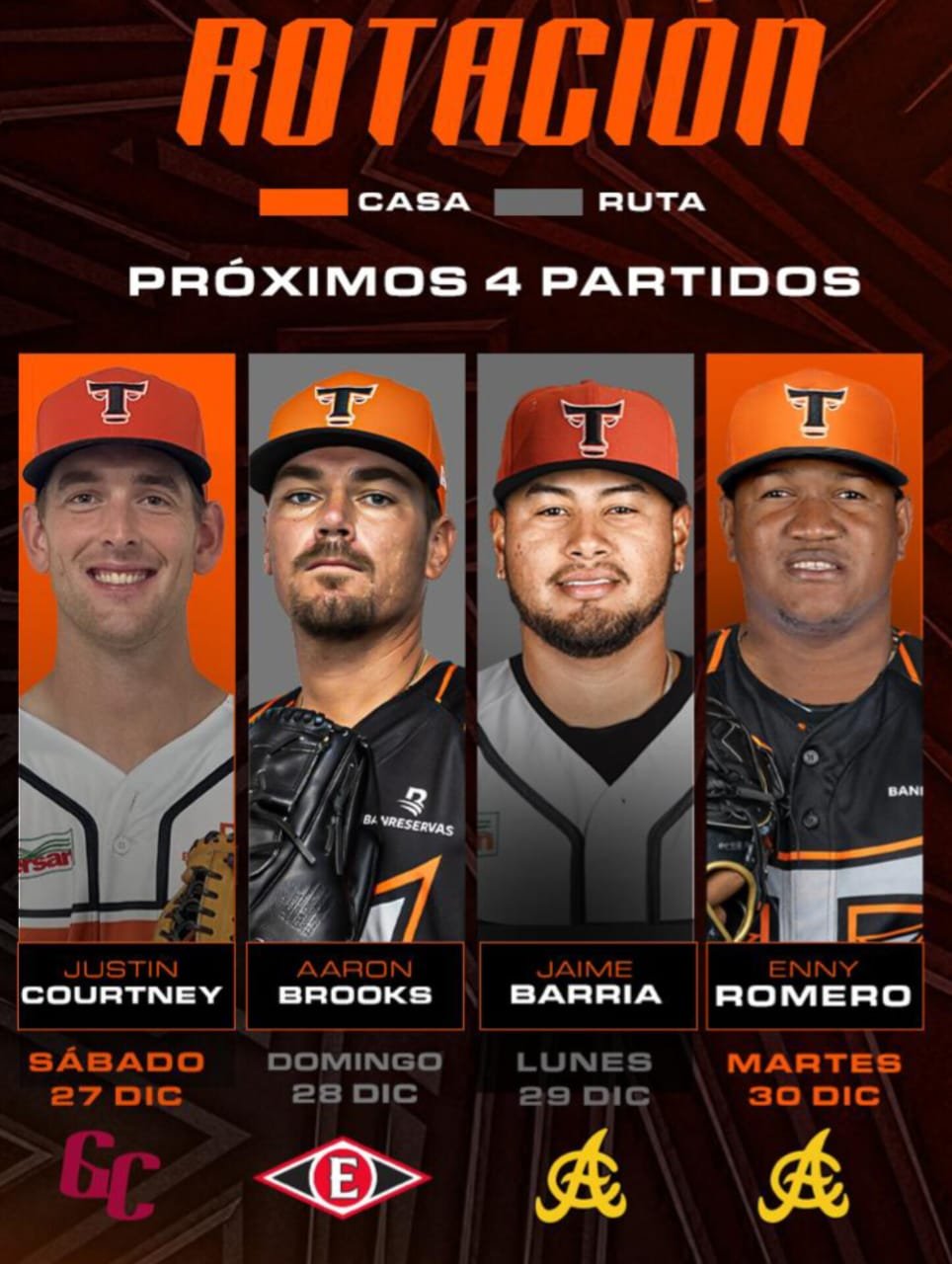 Para el domingo en Santo Domingo, Aaron Brooks subirá al montículo frente a los Leones del Escogido, rival ante el cual tuvo actuaciones destacadas durante la temporada. El lunes en Santiago, el panameño Jaime Barría asumirá la apertura contra las Águilas Cibaeñas, mientras que el zurdo Enny Romero cerrará esta primera secuencia el martes en La Romana, también ante las Águilas. Romero, seleccionado en el Draft de Reingreso, fue uno de los abridores más consistentes del torneo, liderando la liga en entradas lanzadas y manteniendo una efectividad competitiva en el Round Robin a lo largo de su carrera.